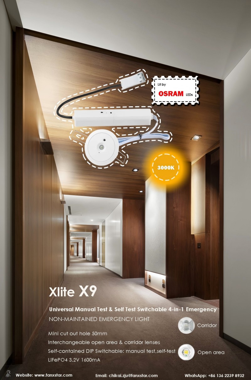 많은 종류의 종류가 있습니다비상 조명휴대용 비상 조명, 화재 비상도, 에너지 절약 비상 조명을 포함하여 응급 조명을 공급하는 비상 조명 등을 포함하여 대부분의 일상 생활에서 널리 사용됩니다. 응급 다운 라이트 X9를 호텔, 학교 및 도서관 복도에 설치할 수 있습니다.