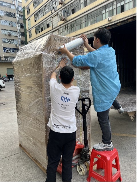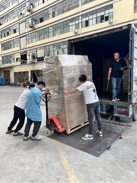 우리 직원은 상품을 포장하여 트럭으로 옮기고 있습니다.