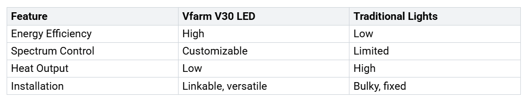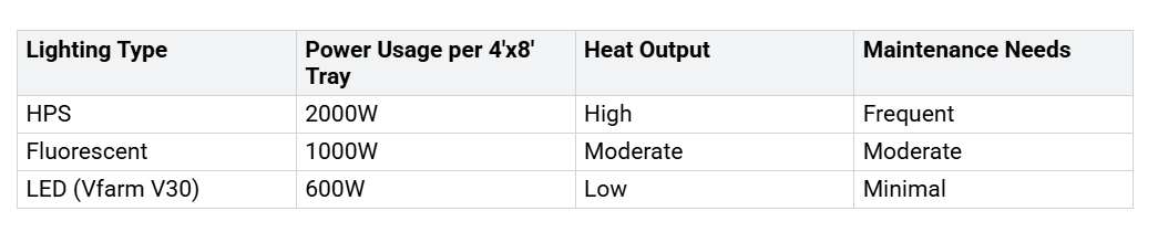 에너지 비용은 실내 정원의 성패를 좌우할 수 있습니다. LED 성장 조명은 놀라운 효율성과 낮은 에너지 소비로 돋보입니다. 기존의 고압 나트륨(HPS) 또는 형광등을 LED로 전환하면 다음과 같이 에너지 사용을 줄일 수 있습니다.50-70%. 대규모 수직 농업에서 LED는 약4'x8' 트레이당 600W, HPS 시스템은 동일한 영역에 대해 최대 2000W가 필요합니다. 이는 상당한 에너지 절약과 낮은 전력 요금으로 이어집니다. LED는 또한 열 방출이 적기 때문에 냉각 비용이 적게 들고 작물에 더 가까운 곳에 조명을 배치할 수 있습니다. Vfarm V30의 통합 드라이버와 IP65 방수 설계는 까다로운 환경에서도 안정적인 성능을 보장하여 유지 관리 및 운영 비용을 더욱 절감합니다.
