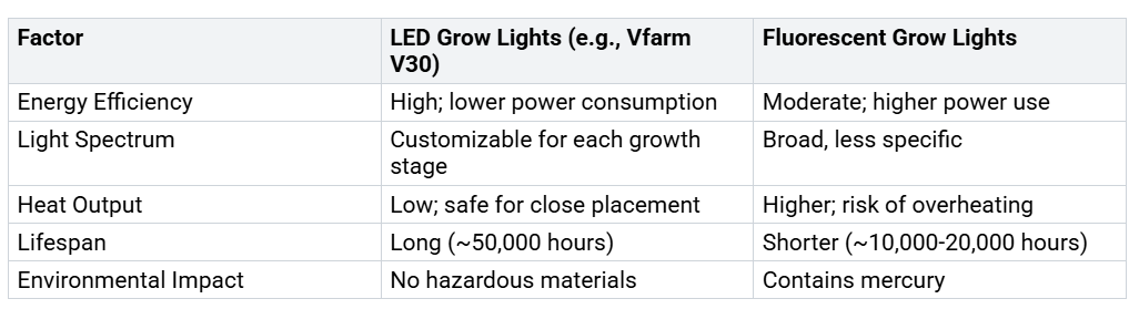 수직 농업과 고급 기술을 통해 재배 환경을 완벽하게 제어할 수 있습니다.에너지 효율, 식물 건강 및 유지 관리. FANXSTAR Vfarm V30과 같은 LED는 맞춤형 광 스펙트럼, 더 긴 수명, 더 안전한 작동을 제공합니다. T5 튜브와 같은 형광등은 더 많은 에너지를 사용하고 더 많은 열을 발생시키며 수명이 더 짧습니다. 또한 특별한 처리가 필요한 수은과 같은 유해 물질도 포함되어 있습니다.
