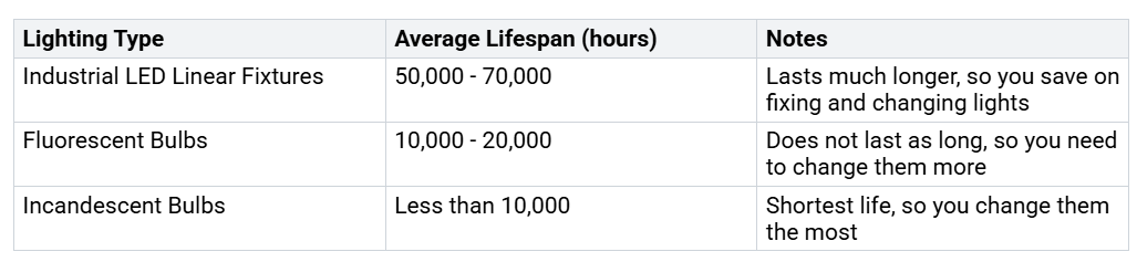 조명 용도전체 에너지의 약 35%상업용 건물에서. LED 선형 조명으로 전환하면 해당 에너지의 최대 70%를 절약할 수 있습니다. 때로는 LED를 사용하여최대 90% 에너지 절감오래된 조명보다 이는 다음을 사용할 수 있음을 의미합니다.조명이 적거나 전력이 적음여전히 동일한 밝기를 얻을 수 있습니다. 또한 전기 요금을 낮추고 건물 배선에 부담을 덜 줍니다. LED는 열을 덜 발생시키므로 작업장이 더 안전하고 냉각이 덜 필요합니다.
