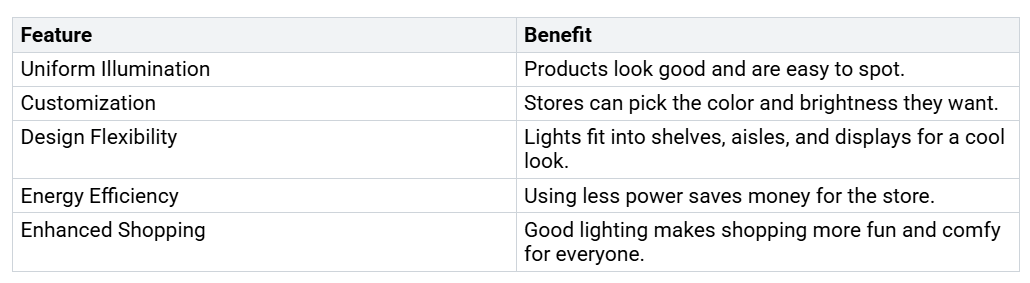 매장에서는 선형 조명을 사용하여 제품을 선보이고 쇼핑을 즐겁게 만듭니다. 밝고 고른 빛은 고객이 모든 것을 명확하게 볼 수 있도록 도와줍니다. 어두운 점이나 거친 그림자가 없습니다. 그만큼아래 표는 선형 조명이 매장에 어떻게 도움이 되는지 보여줍니다.